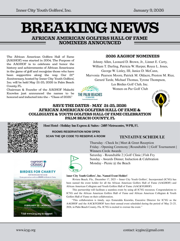 Join Us At : “African American Golfers Hall of Fame & African American Collegiate and Youth Golfers Hall of Fame Conference, Golf, Reception, Dinner, Auction, Awards & Celebration,” May 21-25, 2026